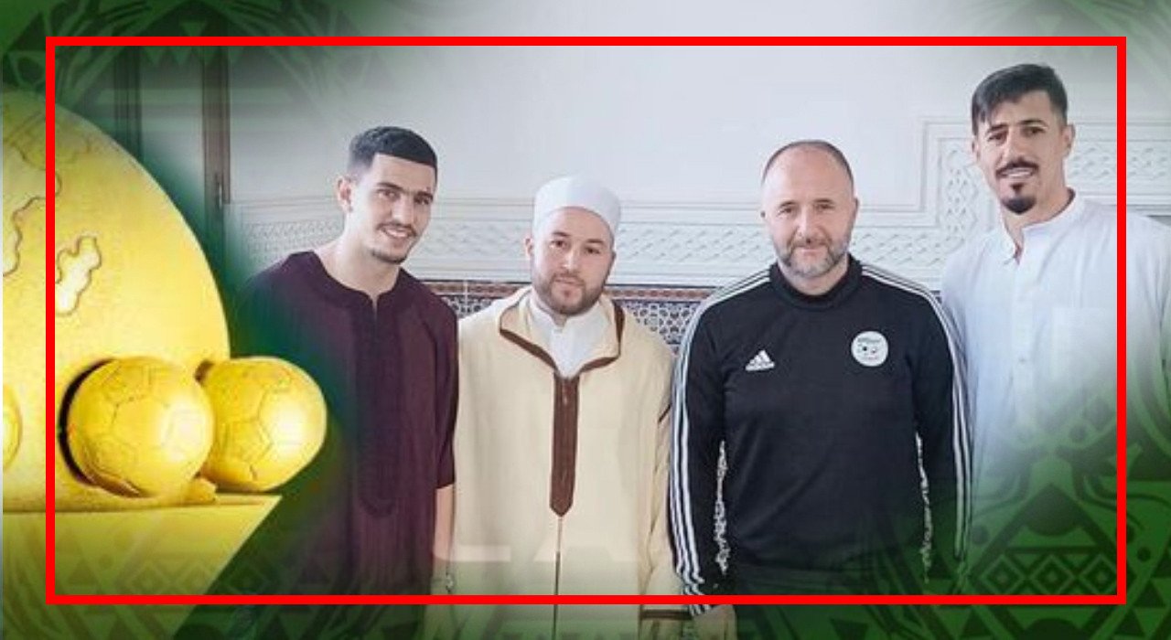 المدرب جمال بلماضي بغداد بونجاح و يوسف عطال بعد صلاة الجمعة الأخيرة قبل التوجه لساحل العاج مع إمام مسجد سيدس موسى